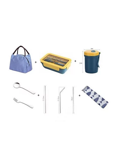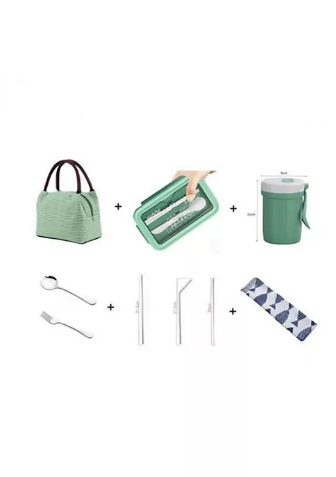 - Bento Box: 4.9in W x 3in D x 8in H Capacity: 37oz Thermos: 3.14in W x 4.3in H Lunch Bag: 9in W x 6.3in D x 7.5in H Staws: 8.5in Long (includes straw cleaning brush)
